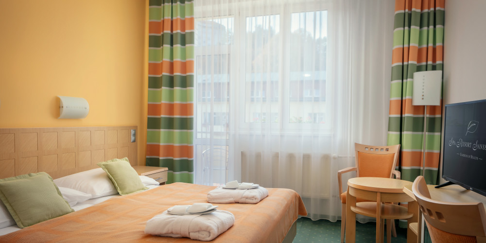 The newly reconstructed single and double rooms in the Spa Resort Sanssouci Karlovy Vary offer their guest four-star comfort at favorable prices. Every room has modern furniture, telephone, minibar and a safety box. It also offers free Wi-Fi internet connection. Bathrooms in these rooms have a bathtub or a shower enclosure, sink, toilet, hair drier and a cosmetic mirror. During their stay our guests are provided with basic toiletries, hotel hand towels and bath towels, and a dressing gown. Some rooms have a balcony that can be request at the time of reservation.